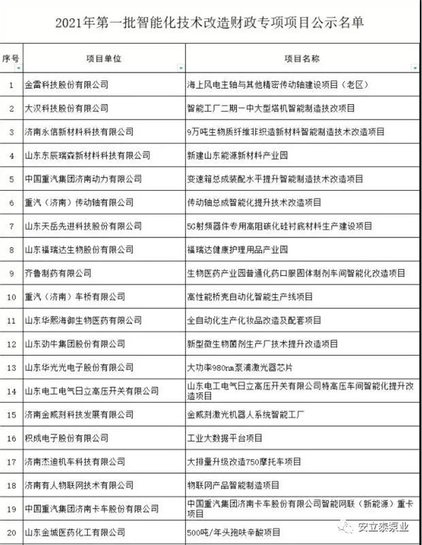 名單公示 | 濟寧安立泰擬入選2021年第一批智能化技術改造財政專項項目