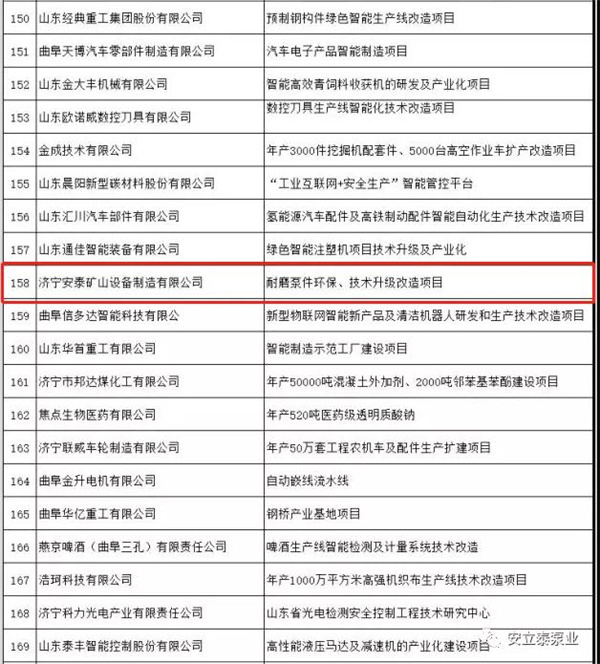 濟寧安泰礦山設備制造有限公司(簡稱安泰泵業)經企業申報、各市推薦、專家評審等環節,入選列入2021年第一批智能化技術改造財政專項項目名單,公示時間為2021年10月11日-15日(5個工作日)。